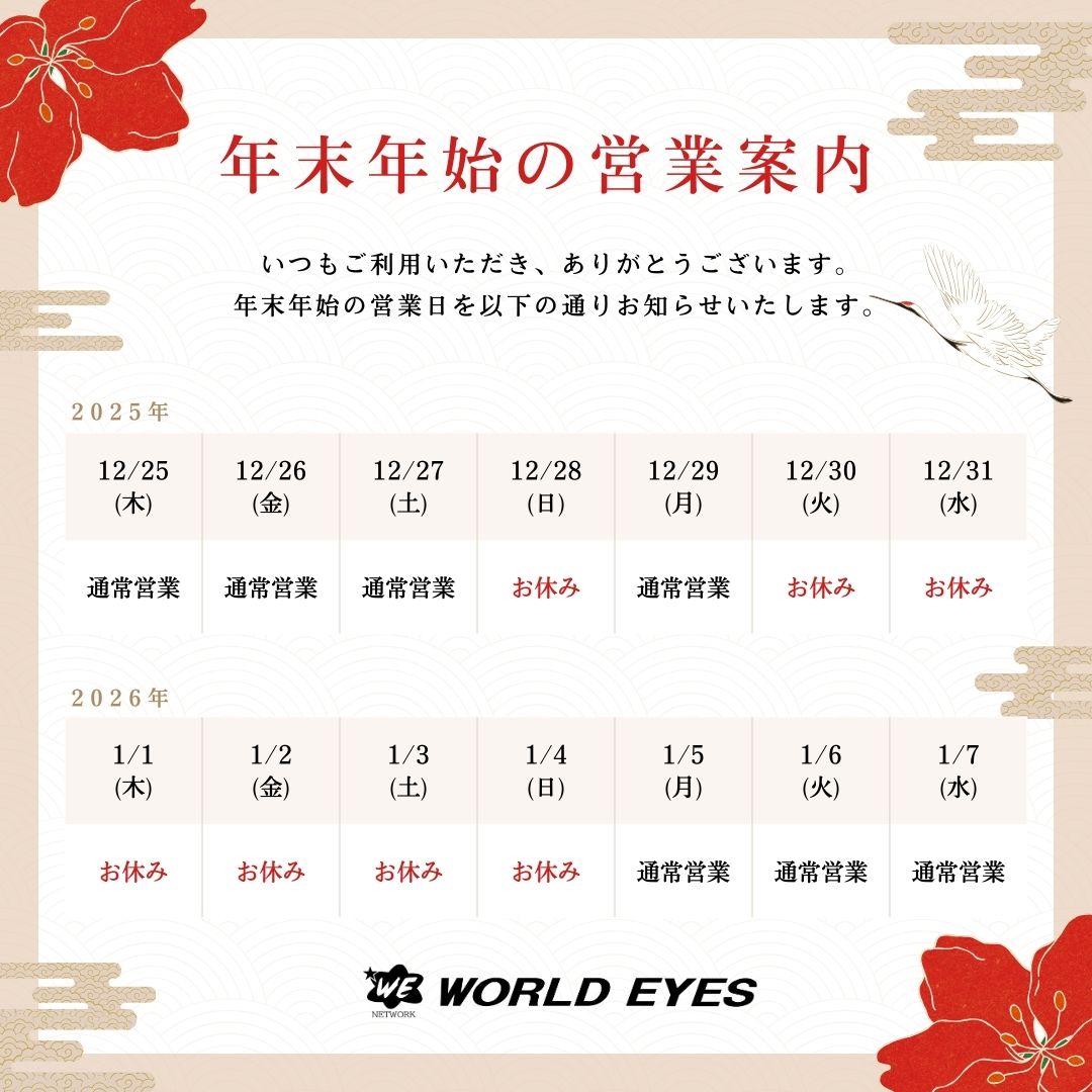 年末年始休業のお知らせ【2025年-2026年】 平素は格別のご愛顧を賜わり、厚くお礼申しあげます。誠に勝手ながら、以下の期間中を年末年始休業とさせていただきます。 <休業期間>2025年12月30日(火)~2026年1月4日(日) 休業期間中にお問い合わせいただいたお客さまには、2026年1月5日 (月) 以降、順次対応させていただきます。 ご不便をおかけいたしますが、ご理解の程、何卒よろしくお願いいたします。※ワールドアイPC東松山本店およびワールドアイPC川越店も同様の休業期間となります。